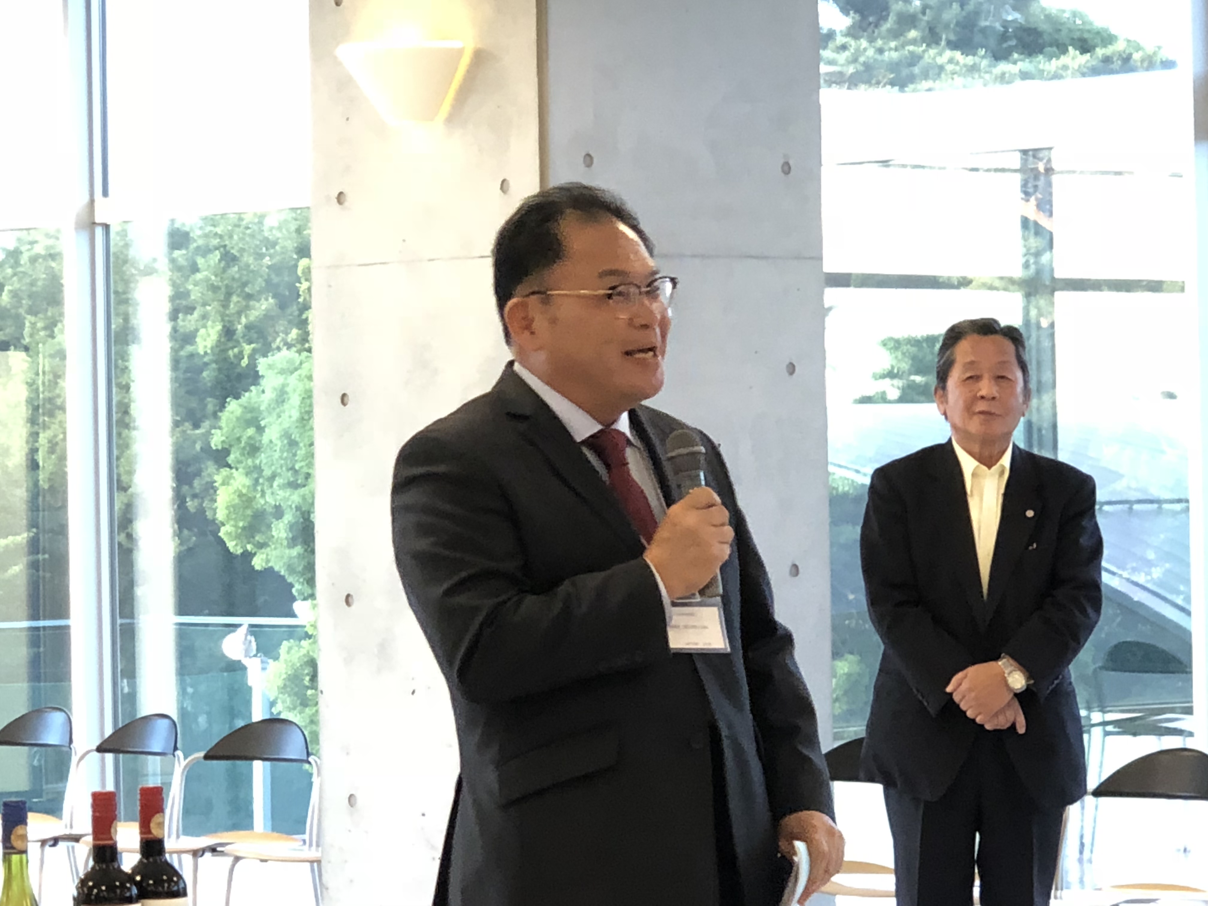 懇親会では、韓国貿易学会会長、高千穂大学理事長藤井様にご臨席賜り、ご祝辞を頂戴いたしました。